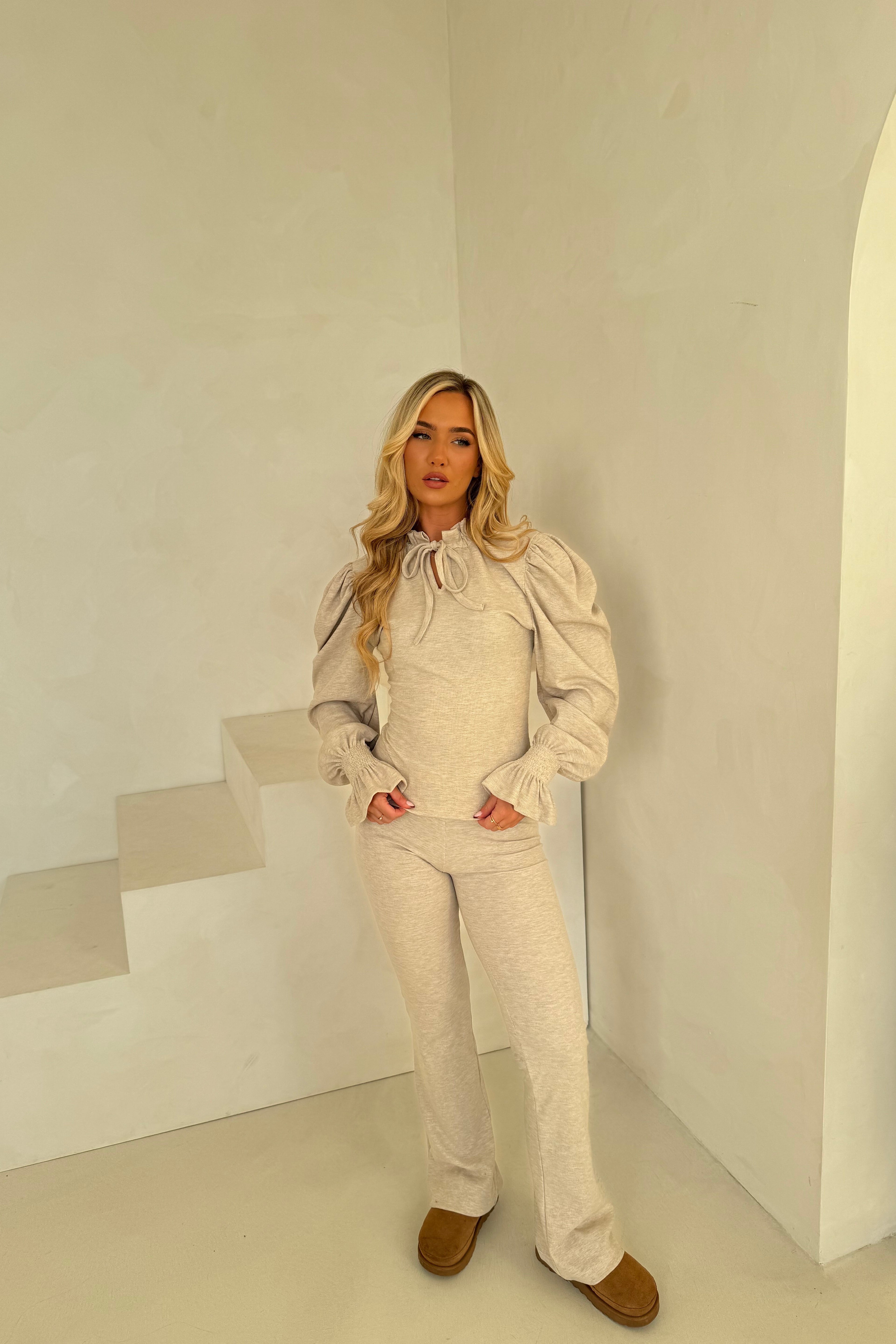 Elevate your style with our Mila Top in Oatmeal Ribbed Jersey. The frilled sleeves and tie collar add a touch of femininity, making it perfect for the fall season. With its cozy yet chic design, it's sure to become your go-to piece for any occasion.