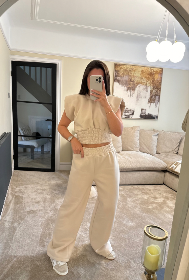 Nelle Shoulder Pad Short Sleeve Sweatshirt in Beige