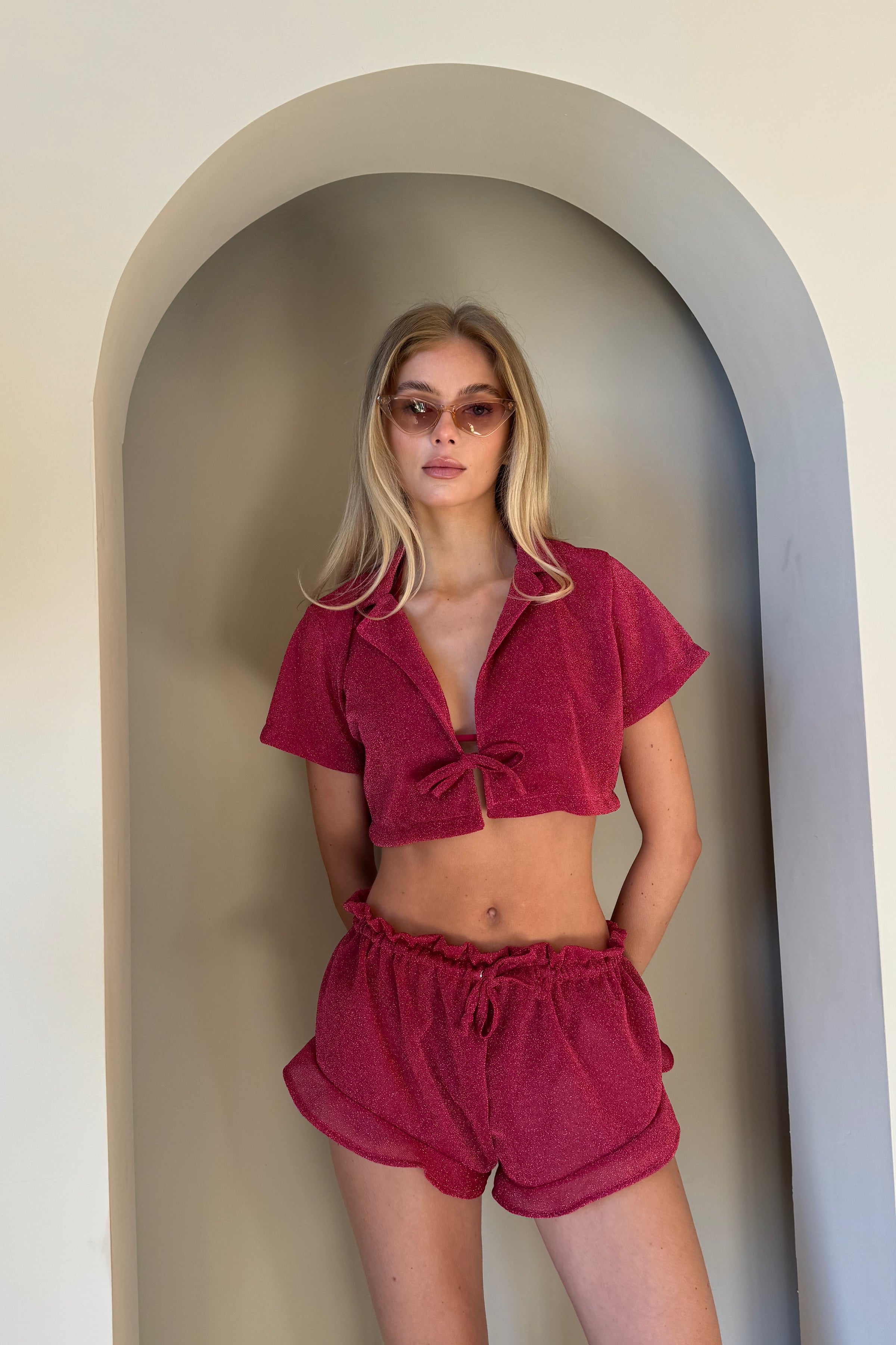 The Alba Tie Shirt is the perfect beach cover up. Made with a glittery fabric, this shirt is both stylish and functional. Its tie detail adds a touch of flair while the lightweight fabric keeps you cool and comfortable. Show off your style with this must-have piece!