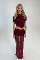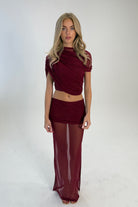 Powermesh Maxi Skirt with Ruched Overlay In Burgundy