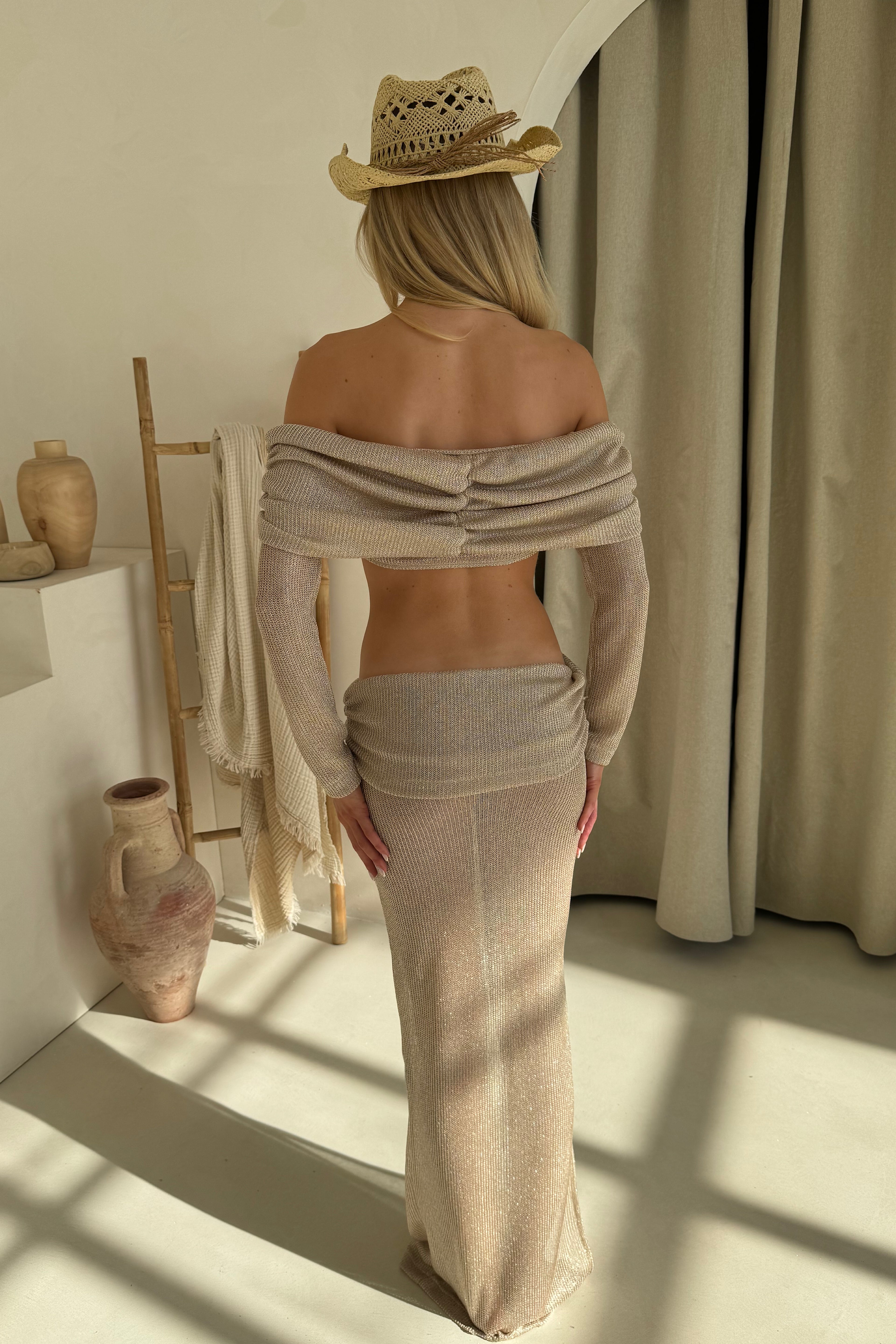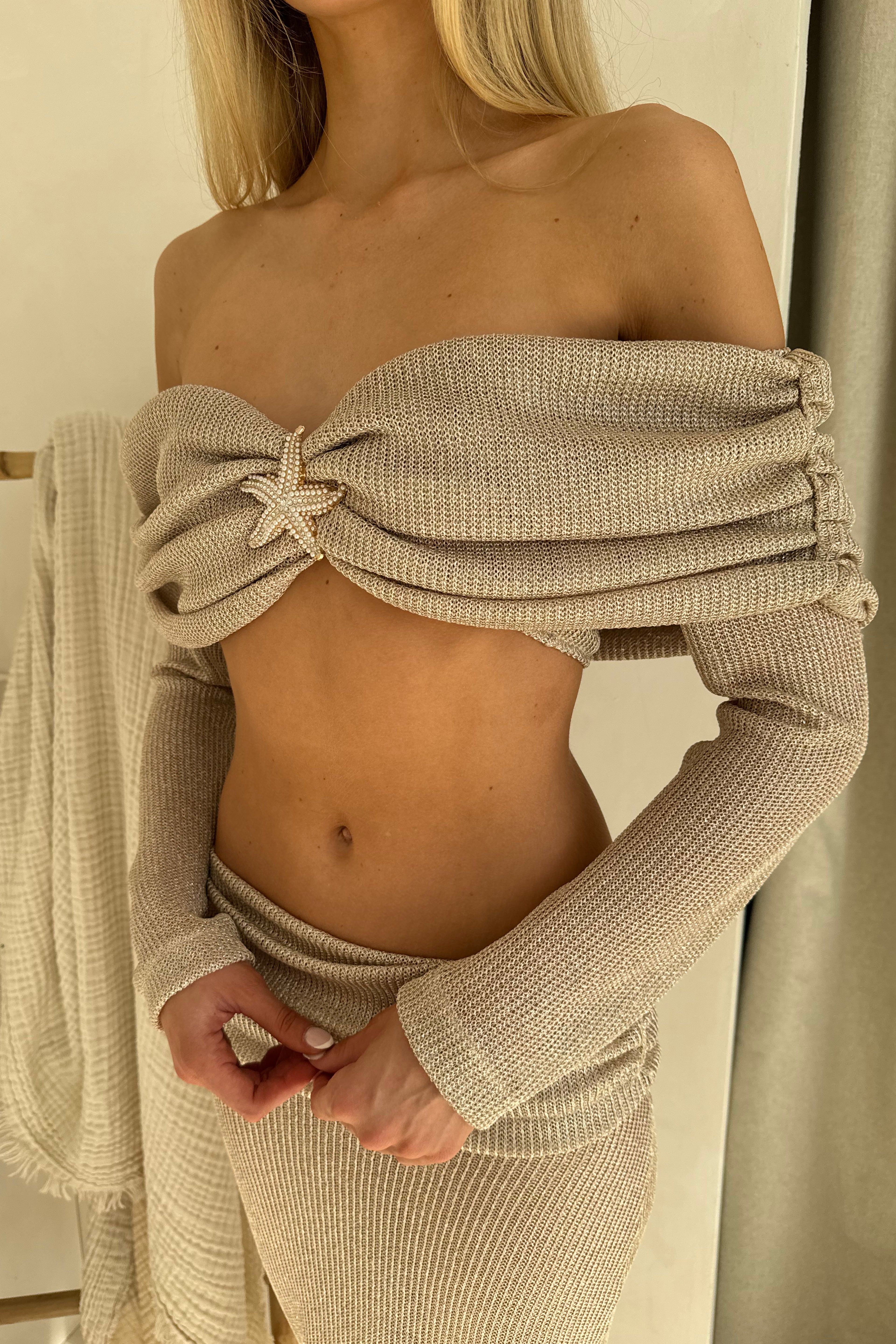 Get ready to shine and stand out in our Gaia Set in Chocolate! Featuring gold pearl starfish detailing, this Bardot top and ruched waist maxi skirt is perfect for your holiday wardrobe.