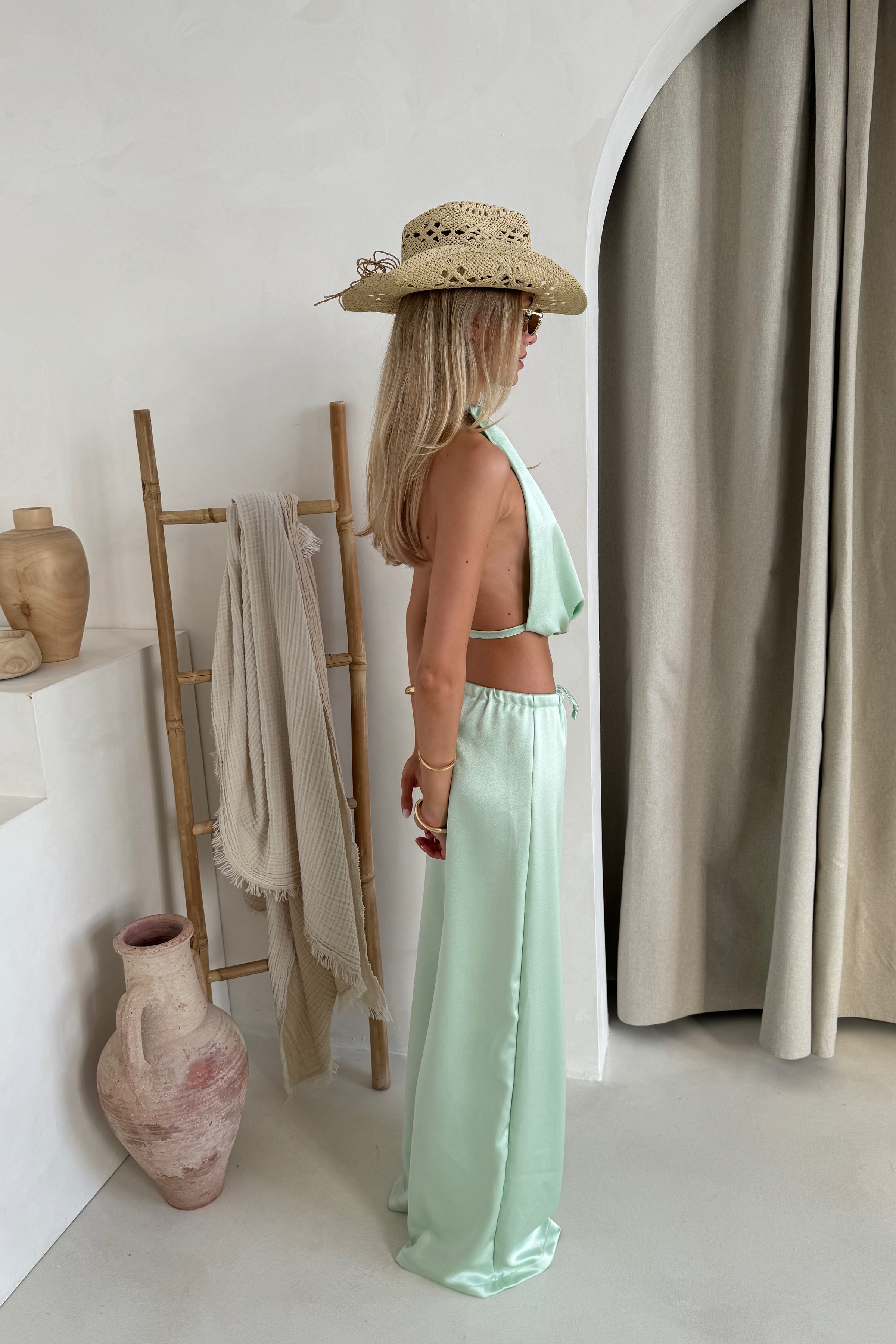 Get ready to shine and stand out in our Shiloh Trouser Set in Pistachio! Featuring a halter neck top and tie waist trouser this set is perfect for your holiday wardrobe.